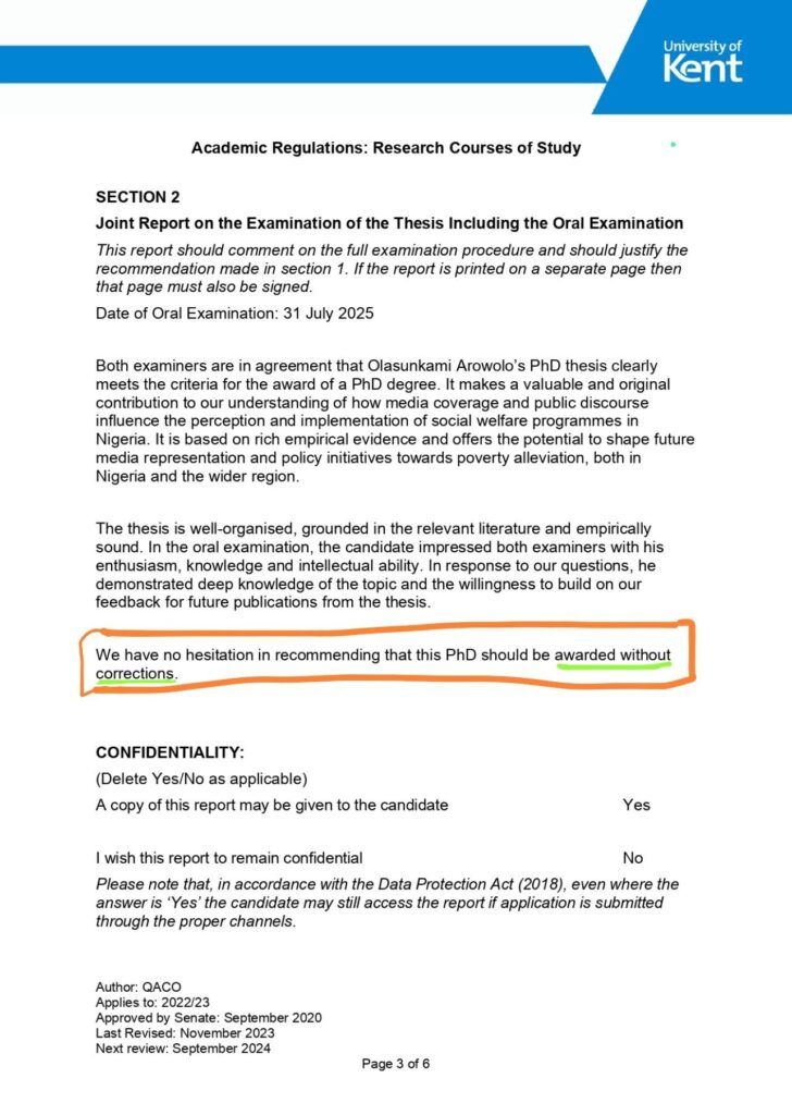 At the time, I was deeply immersed in my doctoral research at the University of Kent, working on my thesis titled “Poverty, Politics, and the Press: Uncovering the Complexities of Media Coverage on Nigeria’s Social Investment Programmes.” My world revolved around data, fieldwork, theory, and writing. I wasn’t thinking about migration or endorsement routes; I simply wanted to finish my PhD well and contribute meaningfully to discussions on media and development.